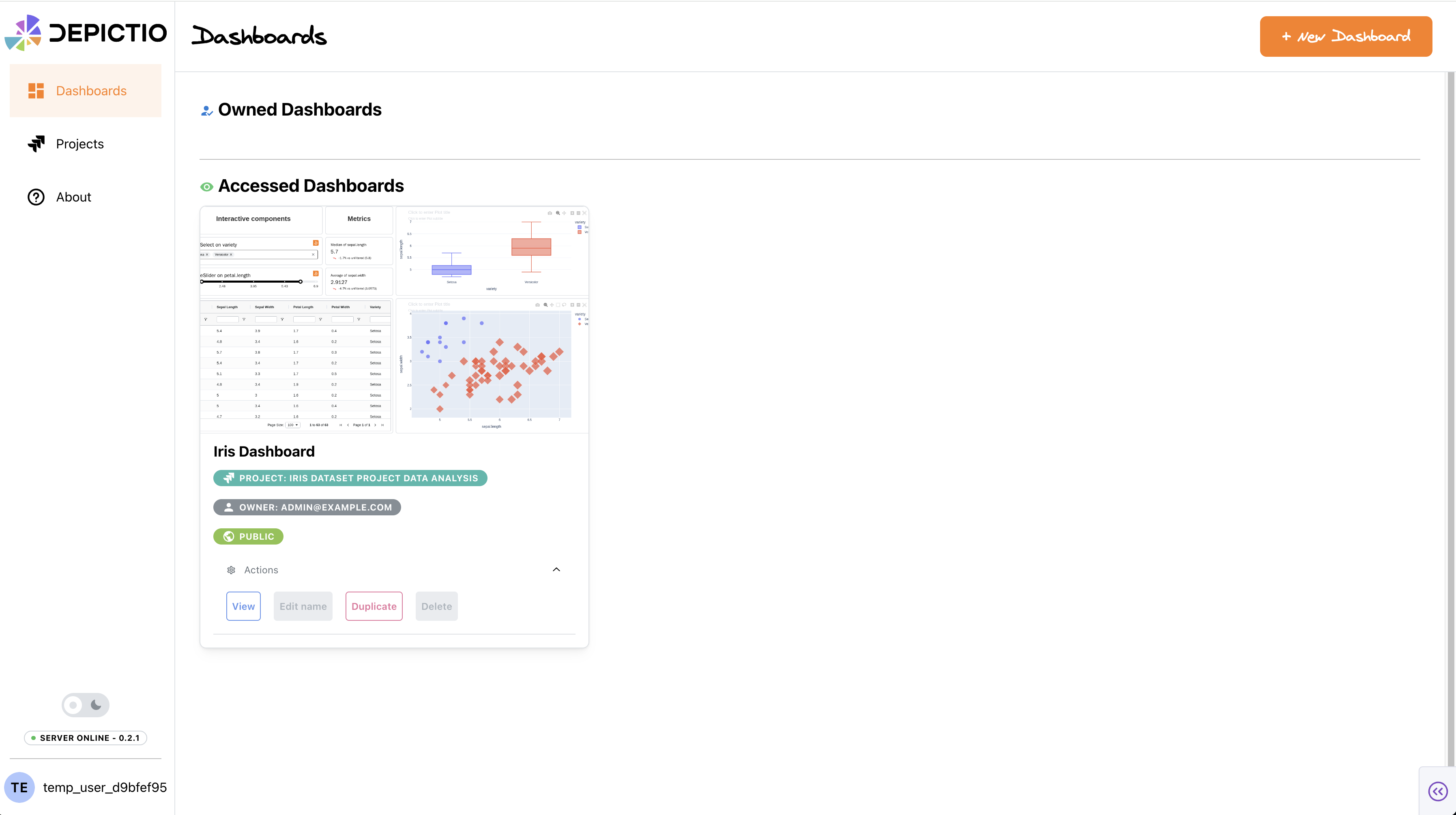 User is now logged in as a temporary user and can access more features (create/duplicate dashboards, create project, upload dataset) for a limited time (24h by default).