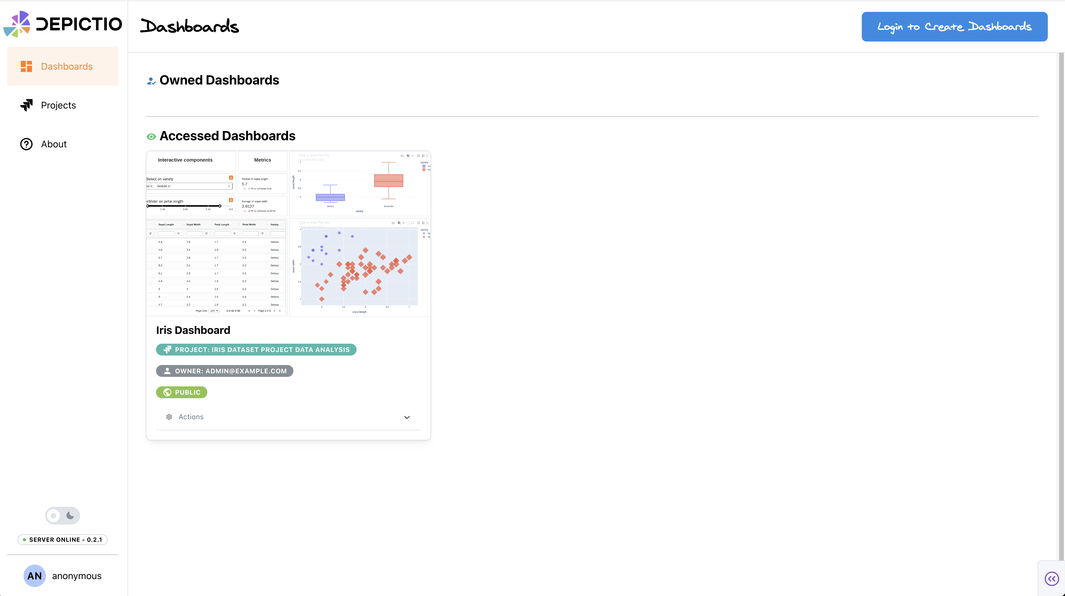 User is logged as anonymous and needs to login to access more features (create/duplicate dashboards, create project, upload dataset)