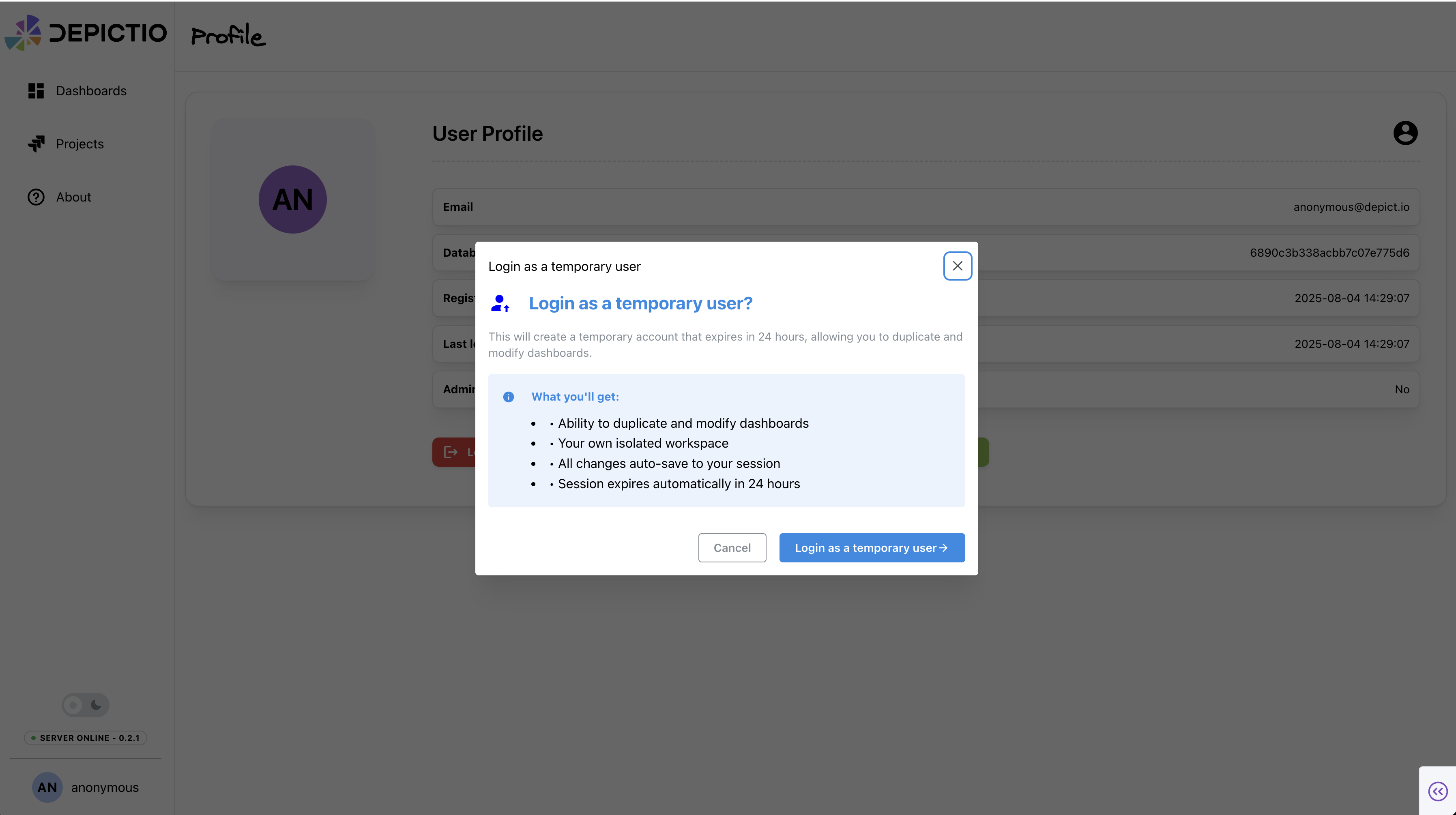 User is now logged in as a temporary user and can access more features (create/duplicate dashboards, create project, upload dataset) for a limited time (24h by default).