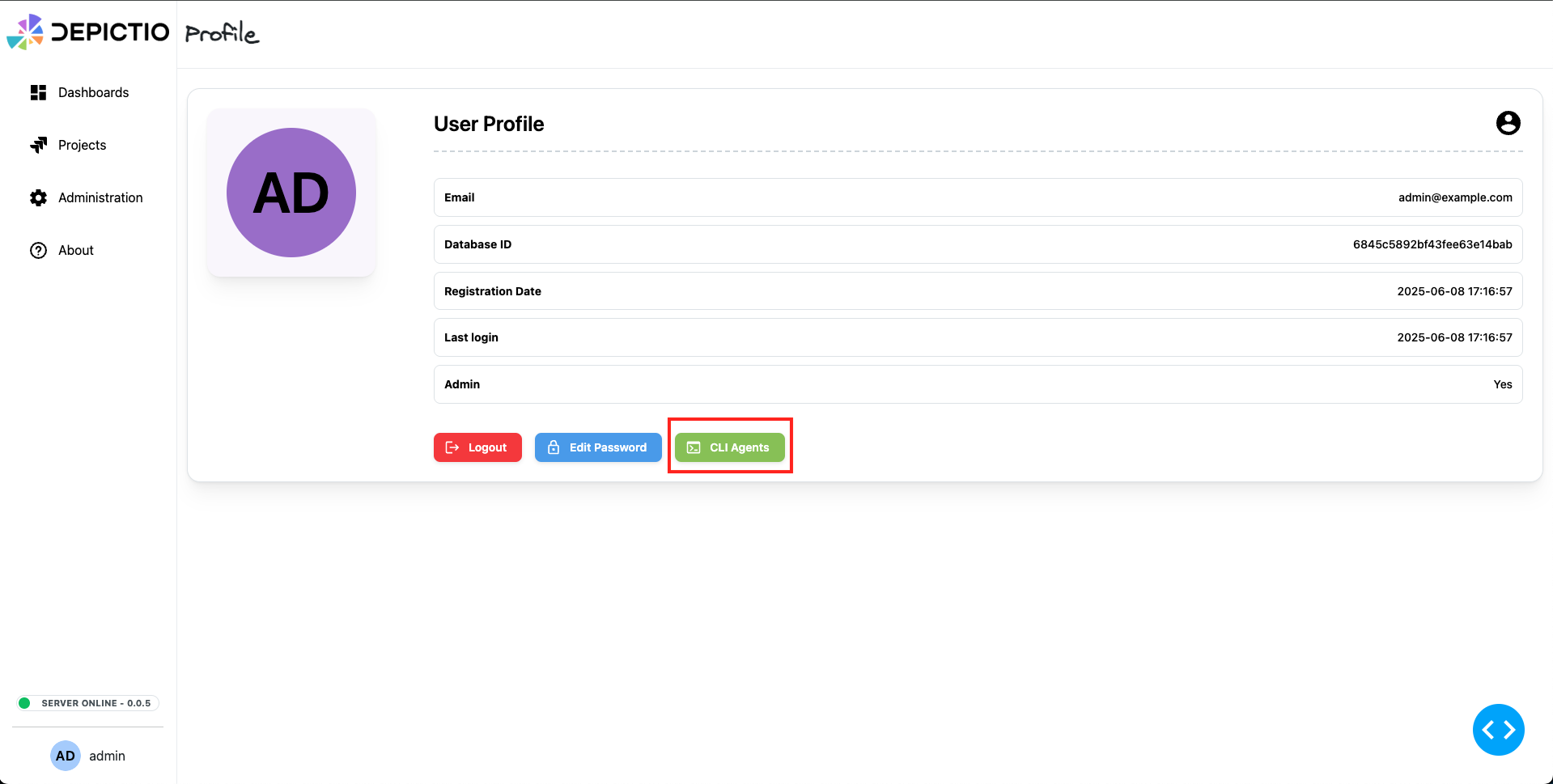 Once you have installed the CLI tool, you need to create a configuration file to interact with Depictio. This configuration file contains the necessary information to connect to your Depictio instance, including the base URL and user credentials. To do so, go to the profile section in the web interface (bottom left corner).