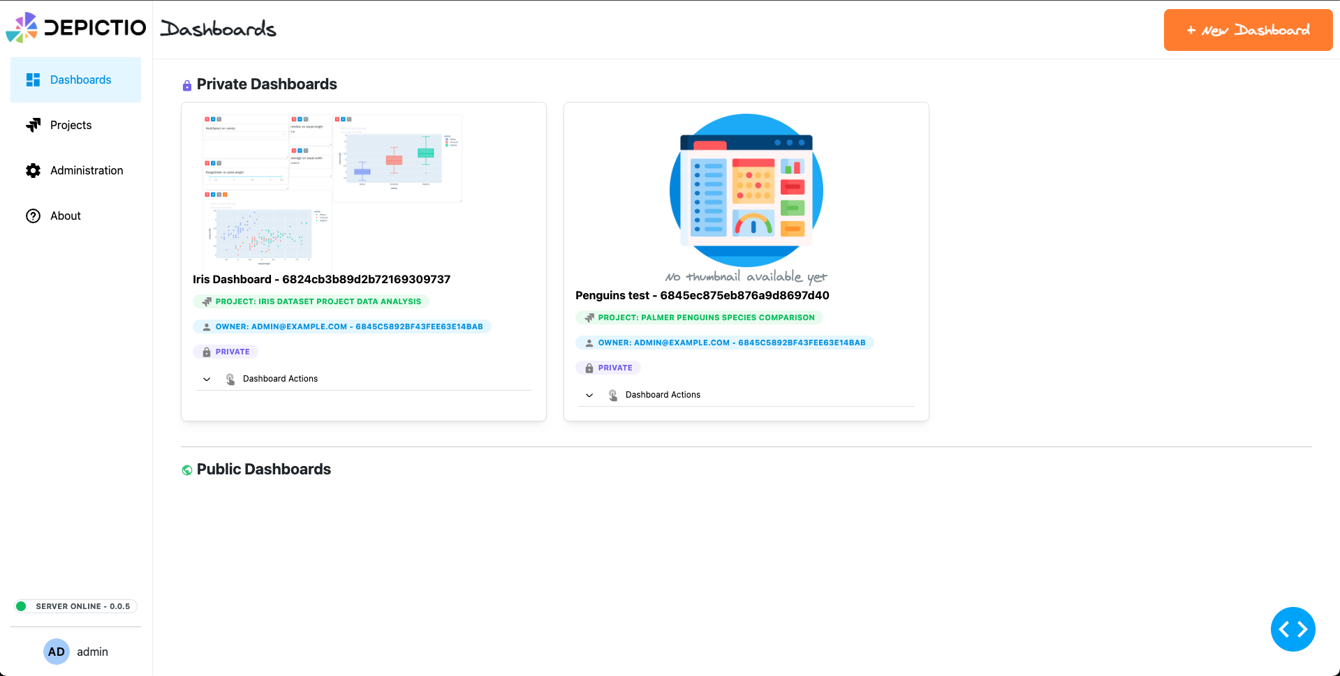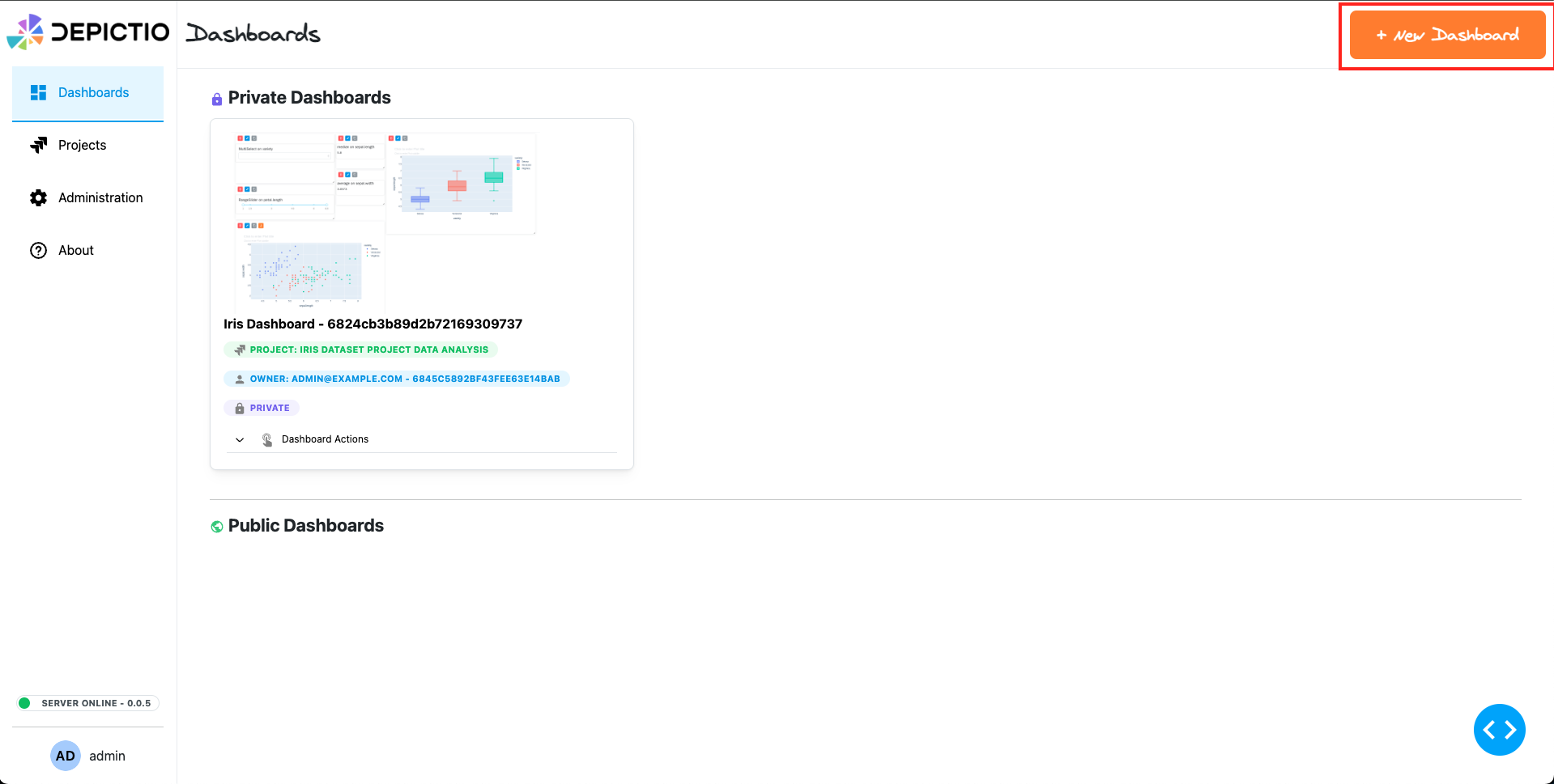 If you want to explore Depictio with existing demo data, you can use the provided registered iris dataset. A demo dashboard is also already created for you to explore. You can access it by clicking on the "Iris Dashboard" on the landing page.
