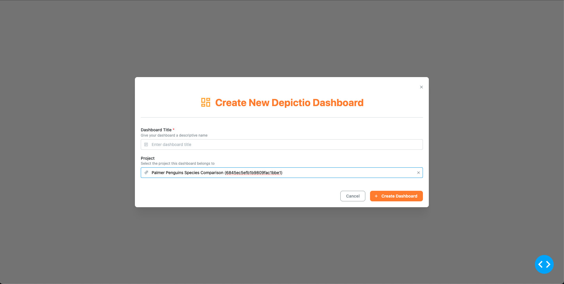 This will open the dashboard creation wizard. Select the Palmer Penguins Species Comparison project from the dropdown menu, and then click on Create Dashboard.